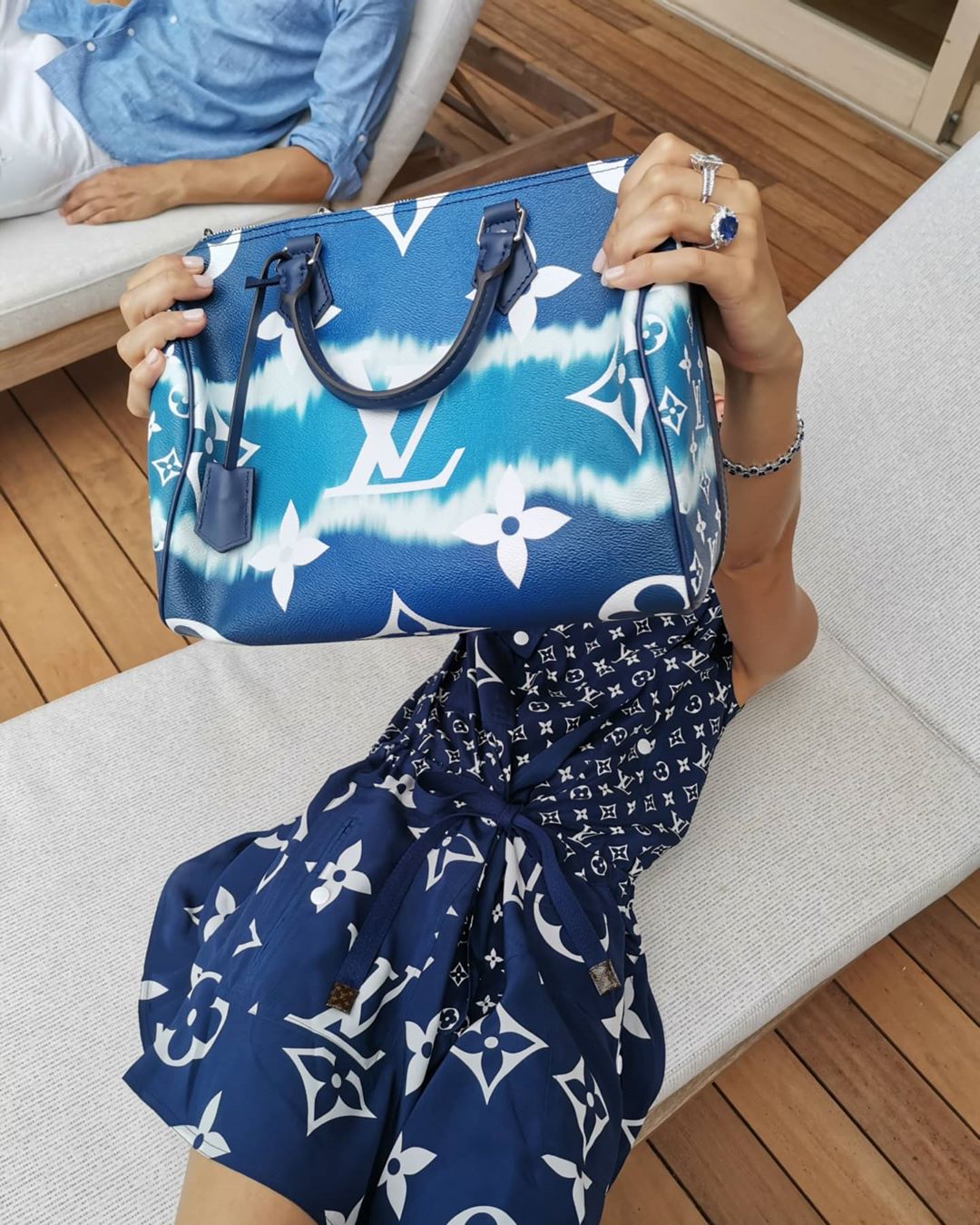 The Sapphire ring and bracelet styled with Virgil Abloh Louis Vuitton new summer cloud series.