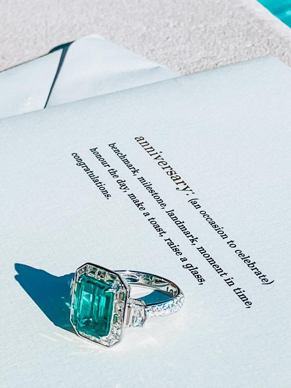 A stunning emerald rounded by trapeze and round brilliant diamonds.