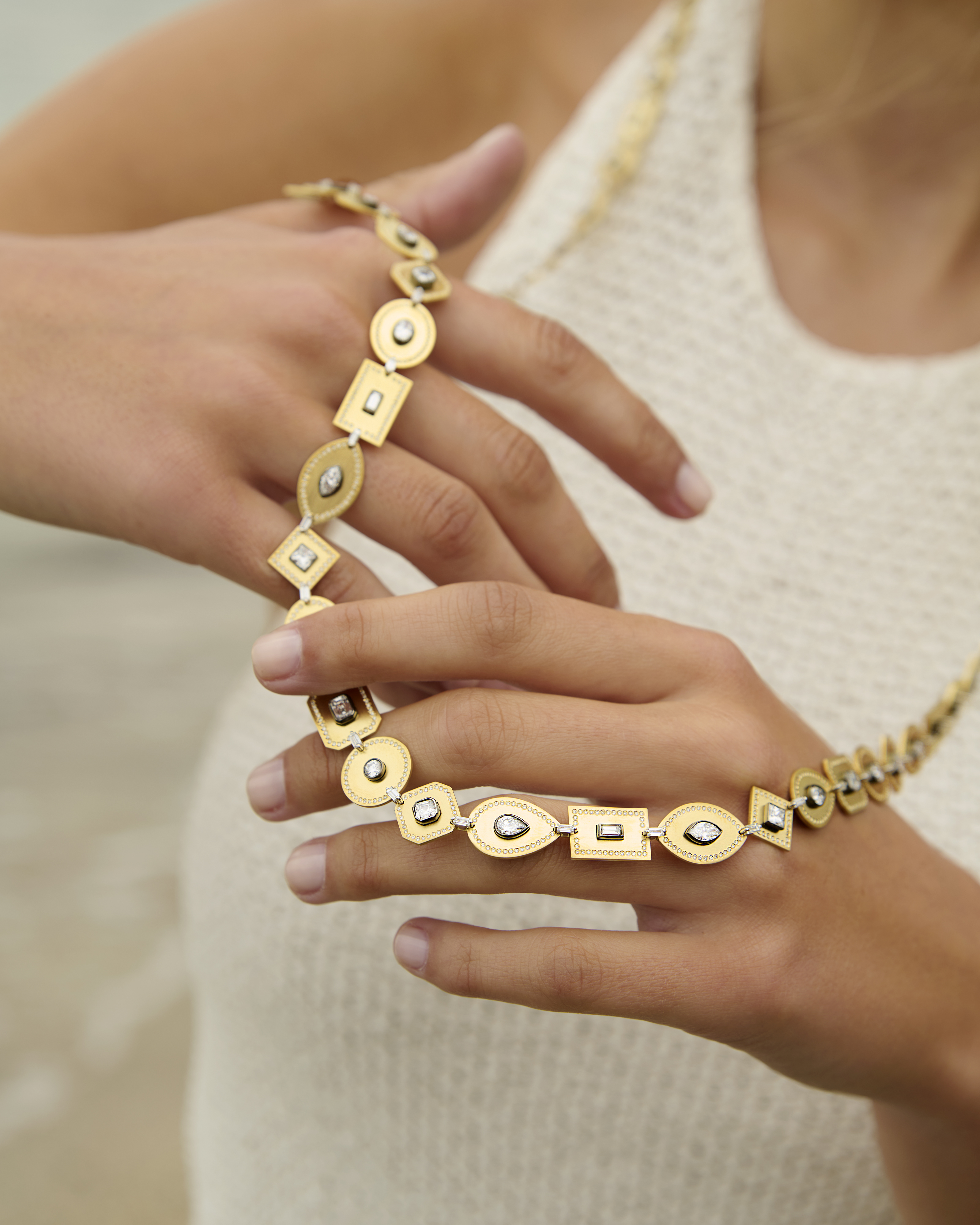an all Danelian set of rivieras, eternities and emerald cuts.